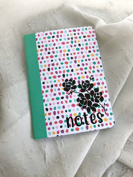 "Notes" with a floral design Colorful polka dot background.